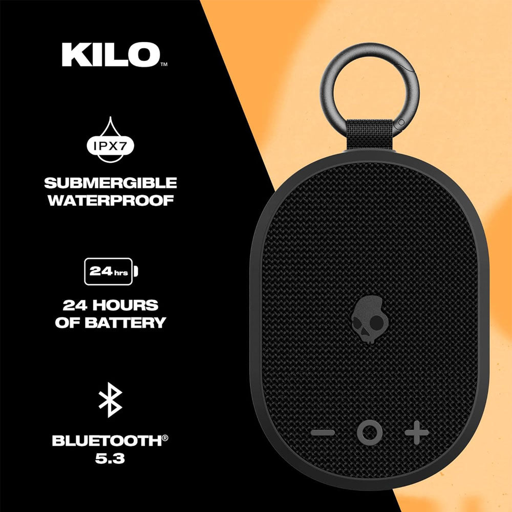 Introducing the Skullcandy Kilo bluetooth speaker bundle. Kilo is big, beautiful sound in a tiny, portable package. This weather-resistant, adventure-ready powerhouse packs big battery life, the latest version of Bluetooth, and a wireless linking system that lets you sync your two Kilo speakers to blast your latest playlist in full stereo. Or, when your buddy shows up with their Kilo, you can sync them up to turn yoru solo sesh into a multi-media event. When other speakers fall short and fail, Kilo is just hitting its stride. With impact-resistant construction and an IPX7 waterproof rating, Kilo can take a beating. It can even be submerged for 30 minutes and come out cranking. And with 24 hours of play time, Kilo packs enough punch to keep the party going around the clock. Kilo even features a convenient clip, so you’ll never forget to bring your tunes along. Hang it on the skatepark fence to add some rhythm to your railsides.